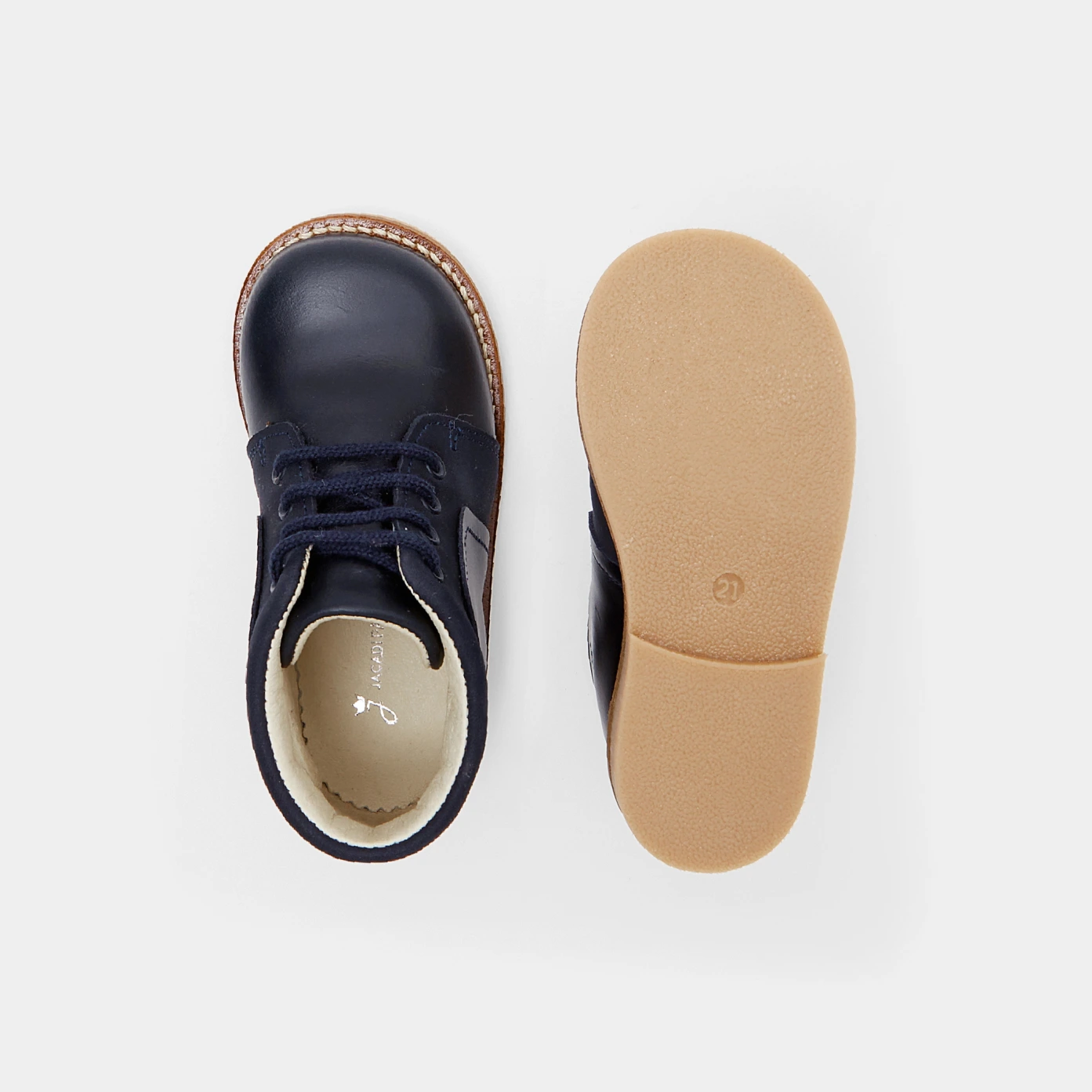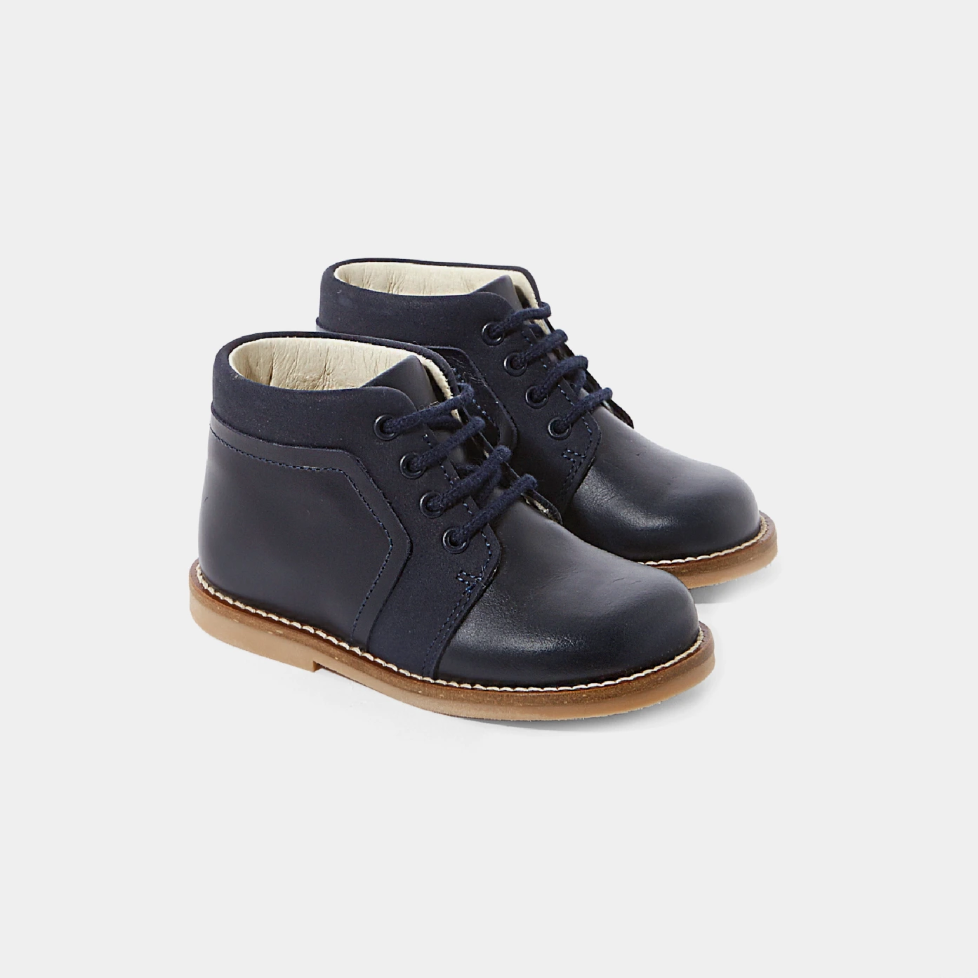 Chlapecké boty této sezóny jsou inspirovány současnými pouštními botami a mají konstrukci z dvou materiálů kůže. Nenápadné stylové boty zdobí vložky ze štípané kůže a kontrastní podrážka. Skvěle se hodí na každodenní nošení, snadno se kombinují s manšestrovými kalhotami a parkou na procházku po Zahradách pod Pražským hradem. - Hladká kůže a štípaná kůže - Zavazování na tkaničky pro bezpečné upevnění u kotníku - Polstrovaný lem, jazyk a stélka - Odolná podrážka - Vyrobeno v Portugalsku - Velikost odpovídá.