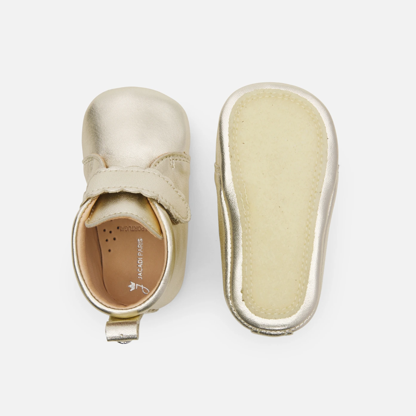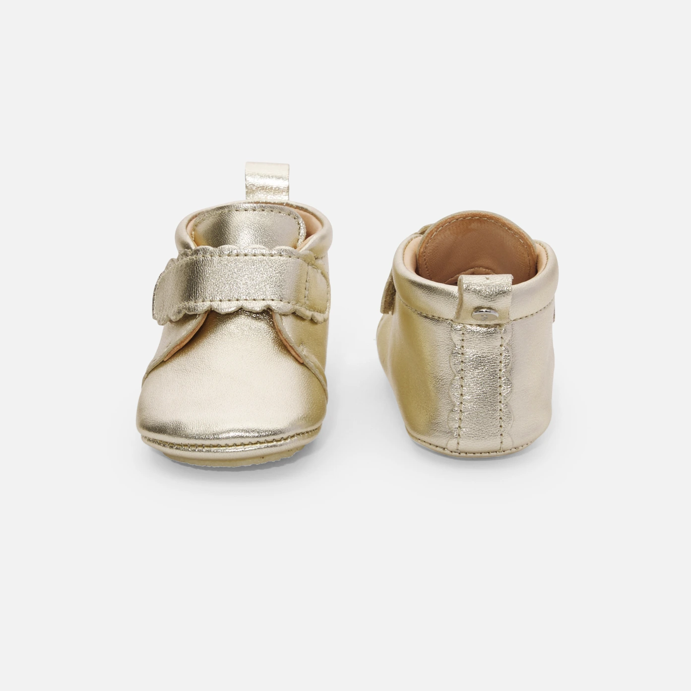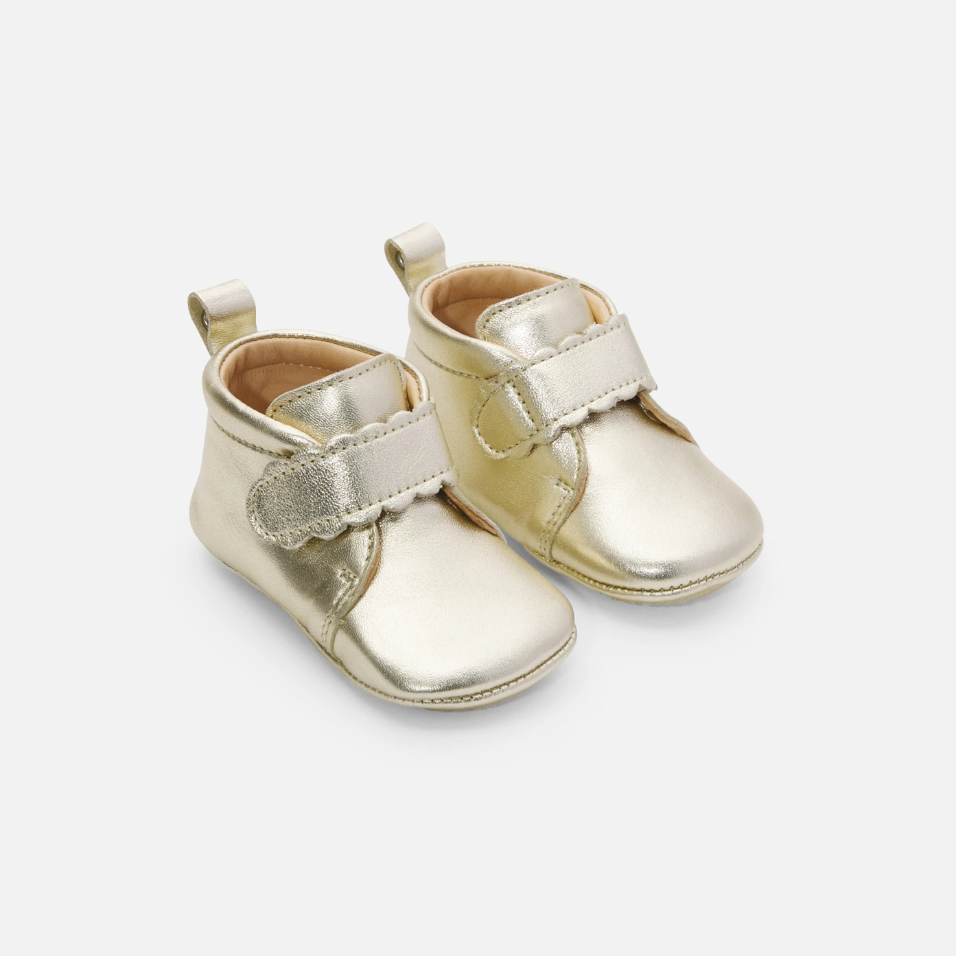 Navrženy jako malé botičky a snadno se obouvají díky suchému zipu, tyto kojenecké dívčí bačkůrky jsou k dispozici ve zlaté nebo stříbrné kůži. Mají pěnový límec a jazyk pro pohodlí a podporu, a protiskluzovou podrážku. Perfektní pro školku i domov, přidají vašemu malému outfitu nádech třpytu.