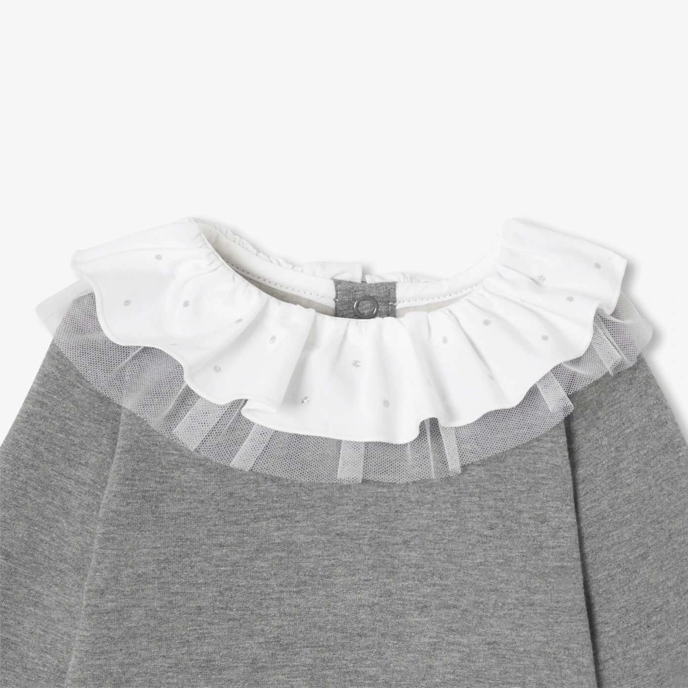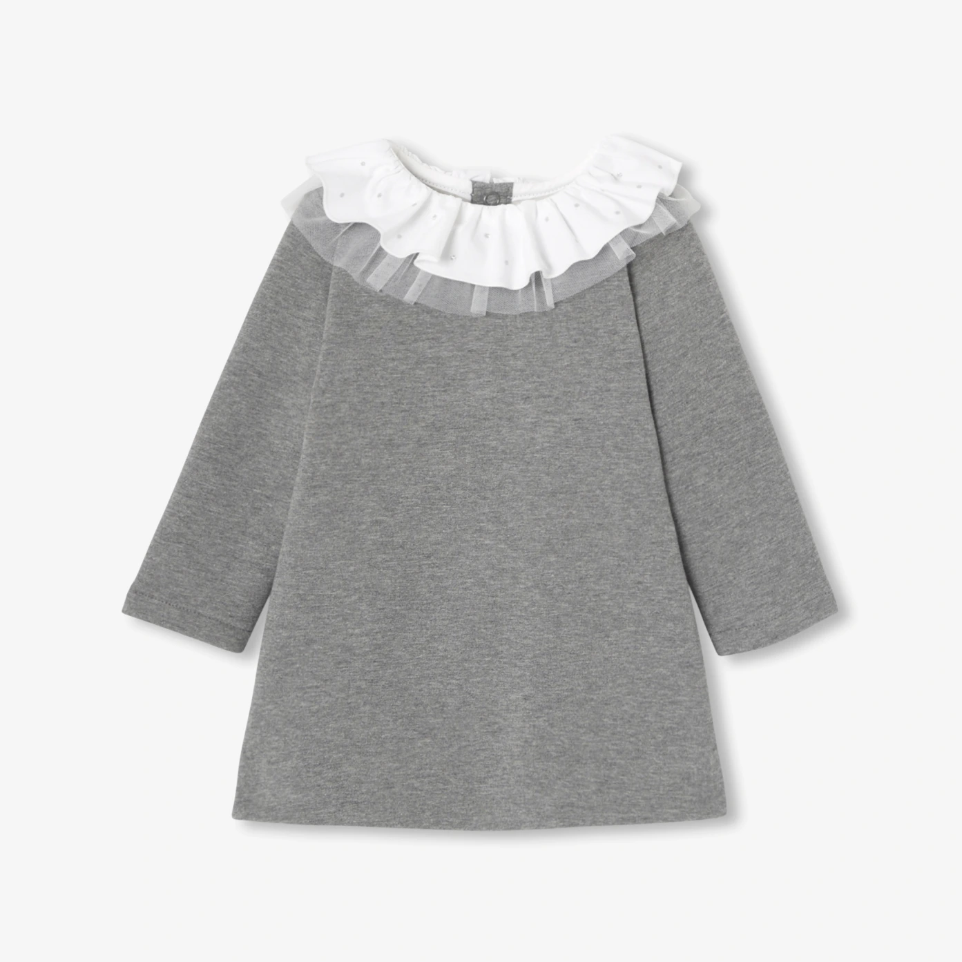 Kombinací pohodlí fleecu s moderní elegancí detailního výstřihu získávají tyto dívčí šaty na zimu na modernosti. Měkký a snadno se nazouvá a má dvojitý volán z popelínu a tylu se stříbrnými puntíky. Nošené s punčochami a pěknou Mary Janes na sváteční období, je to skvělý dárek.- Flísové dívčí šaty z biobavlny- Dlouhé rukávy- Dvojitý volán- Popelínový volán- Tylový volán se stříbrnými puntíky- Zapínání na patentky vzadu