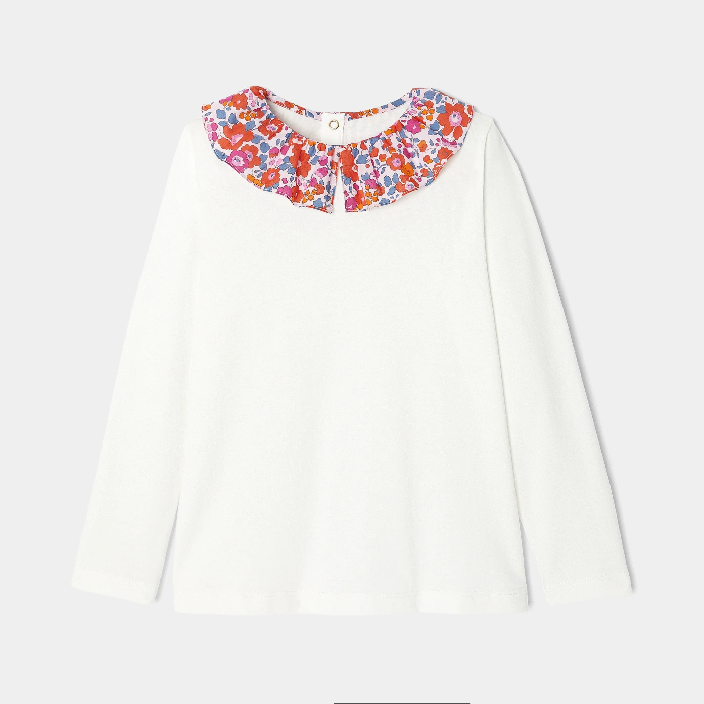 Toto tričko s dlouhým rukávem kombinuje pohodlí organické bavlny s elegancí límečku z látky Liberty. Jde o nepostradatelný a pohodlný model na každodenní nošení, který bude skvěle ladit s širokými kalhotami nebo kalhotovou sukní. - Organická bavlna – Límeček z látky Liberty Betsy, exkluzivní barvy Jacadi