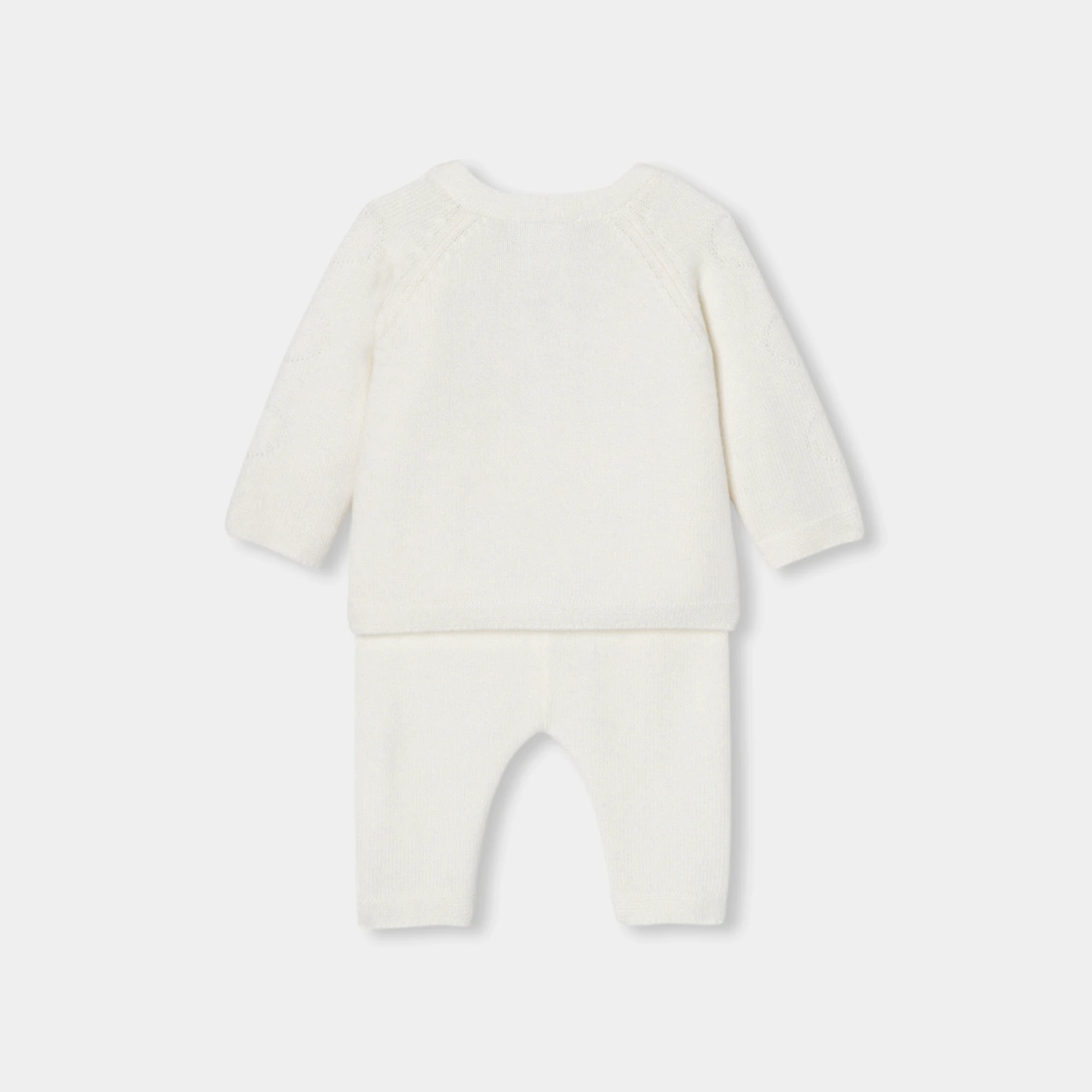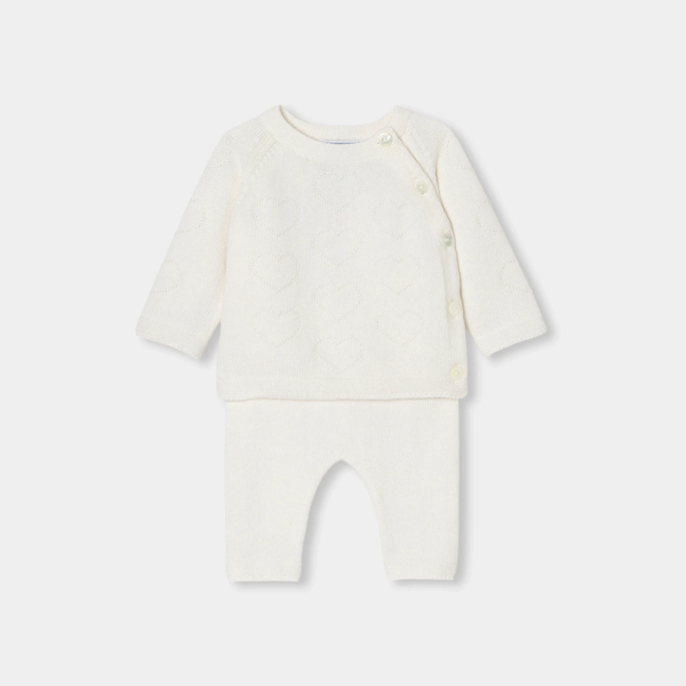 Rediscover the elegance and savoir-faire of Jacadi in this baby girl set. Combining the softness of a wool and cashmere knit with the modernity of a tone-on-tone heart motif, this warm and comfortable cocoon slips on easily thanks to its front button fastening and elasticated trousers. Worn in the heart of winter for everyday wear and the festive season, it is a great gift to offer.- Baby girl set in wool and cashmere- Heart motif front and sleeves- Front opening with natural mother-of-pearl buttons- Trousers with elasticated waistband